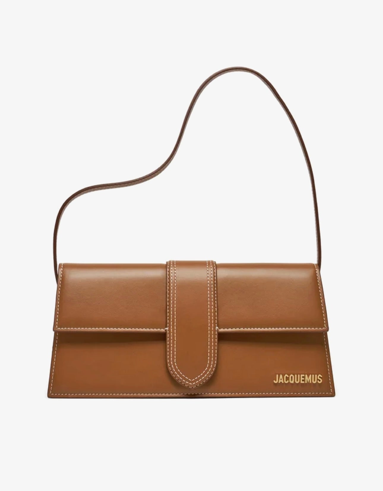 Marrone caramello, pelle di vitello, placca con logo color oro, applicazione interna con logo, battente nella parte superiore con chiusura magnetica, manico piatto e scomparto unico.