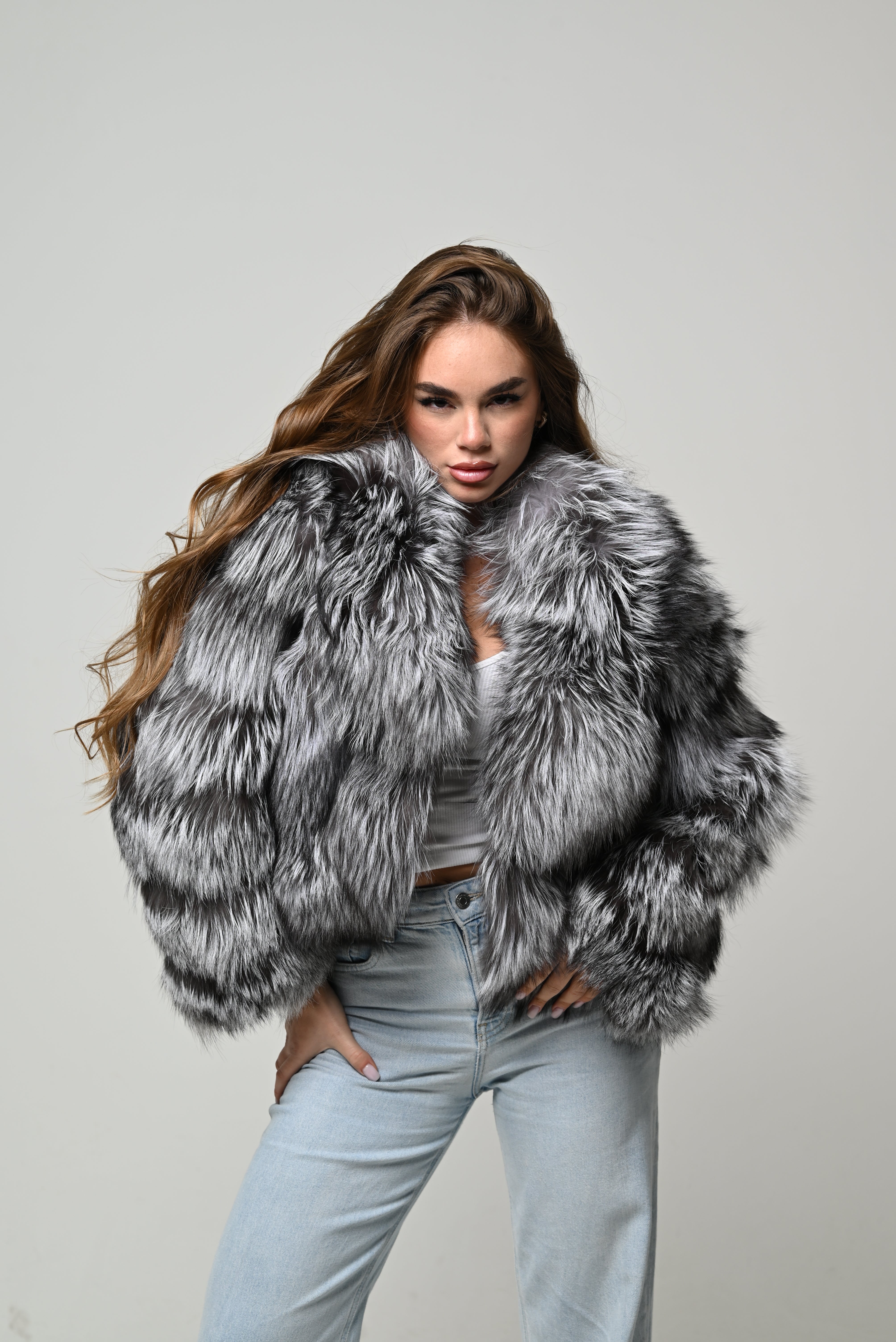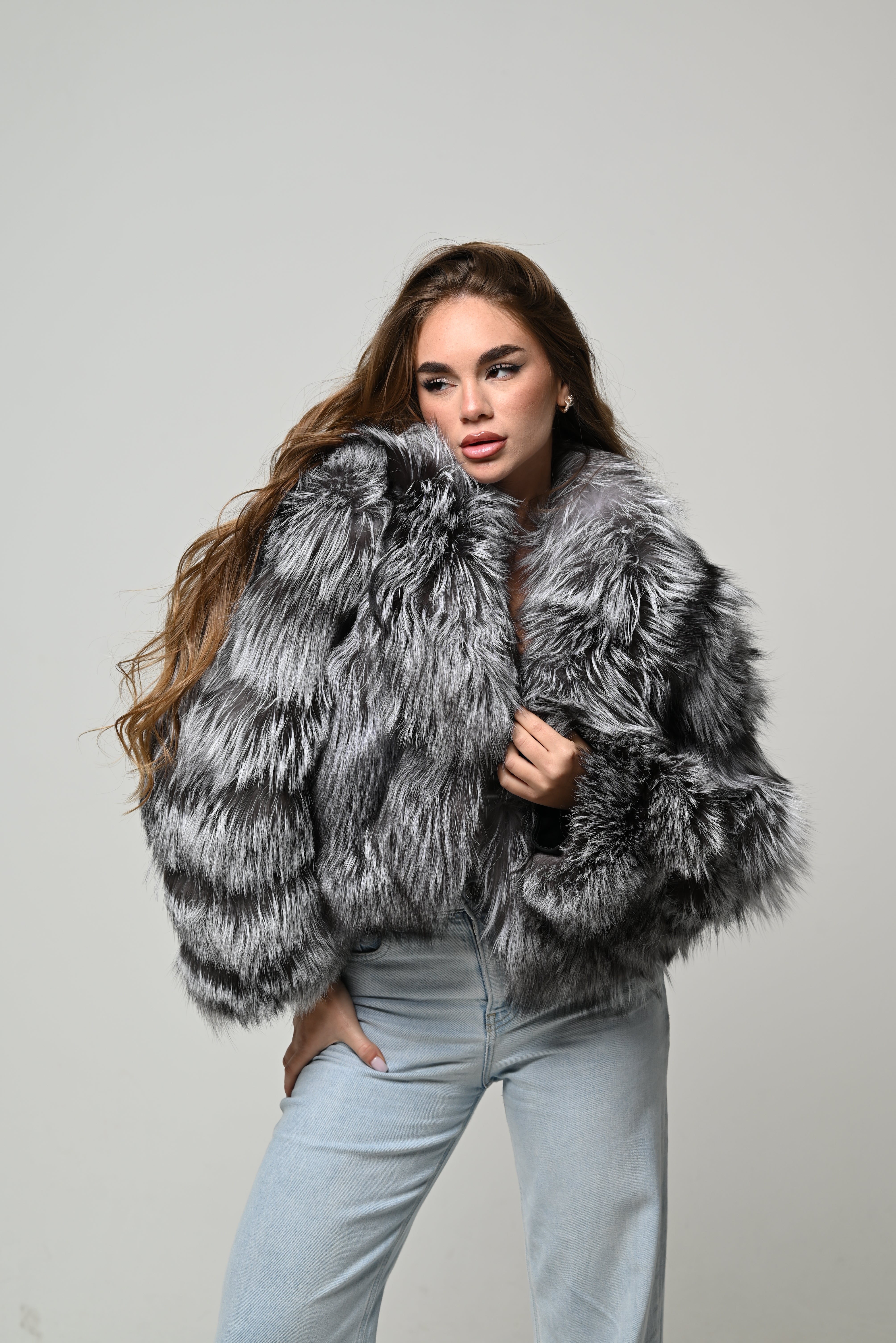 modello corto con volume importante e vestibilità regolare. Pelo lungo, pieno e ultra soffice, caratterizzato da una raffinata sfumatura grigio–argento con contrasti naturali più scuri che donano profondità e movimento. Lavorazione a fasce orizzontali, maniche ampie e scollo aperto per una silhouette decisa e contemporanea. Chiusura frontale invisibile e interno foderato per un comfort ottimale.