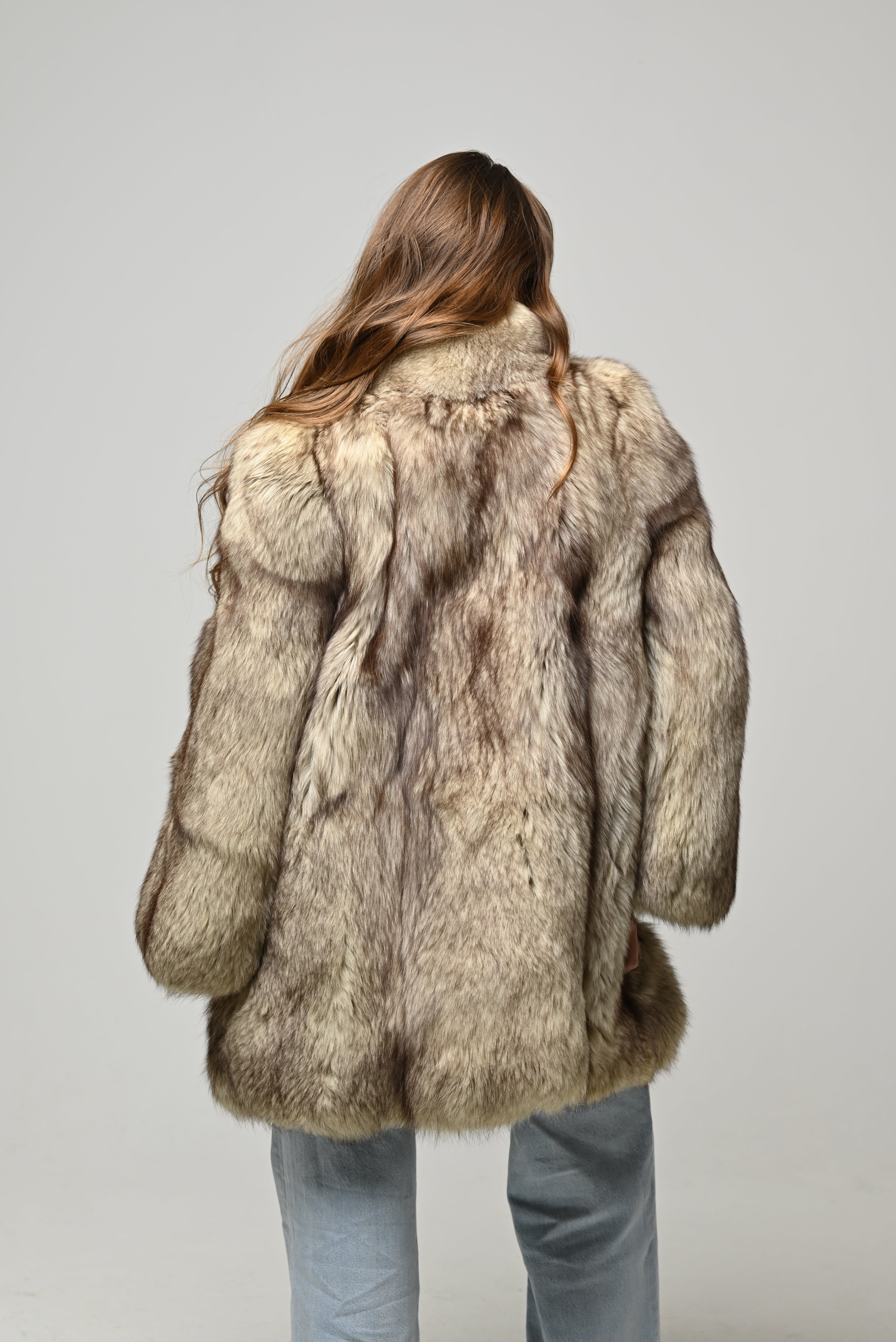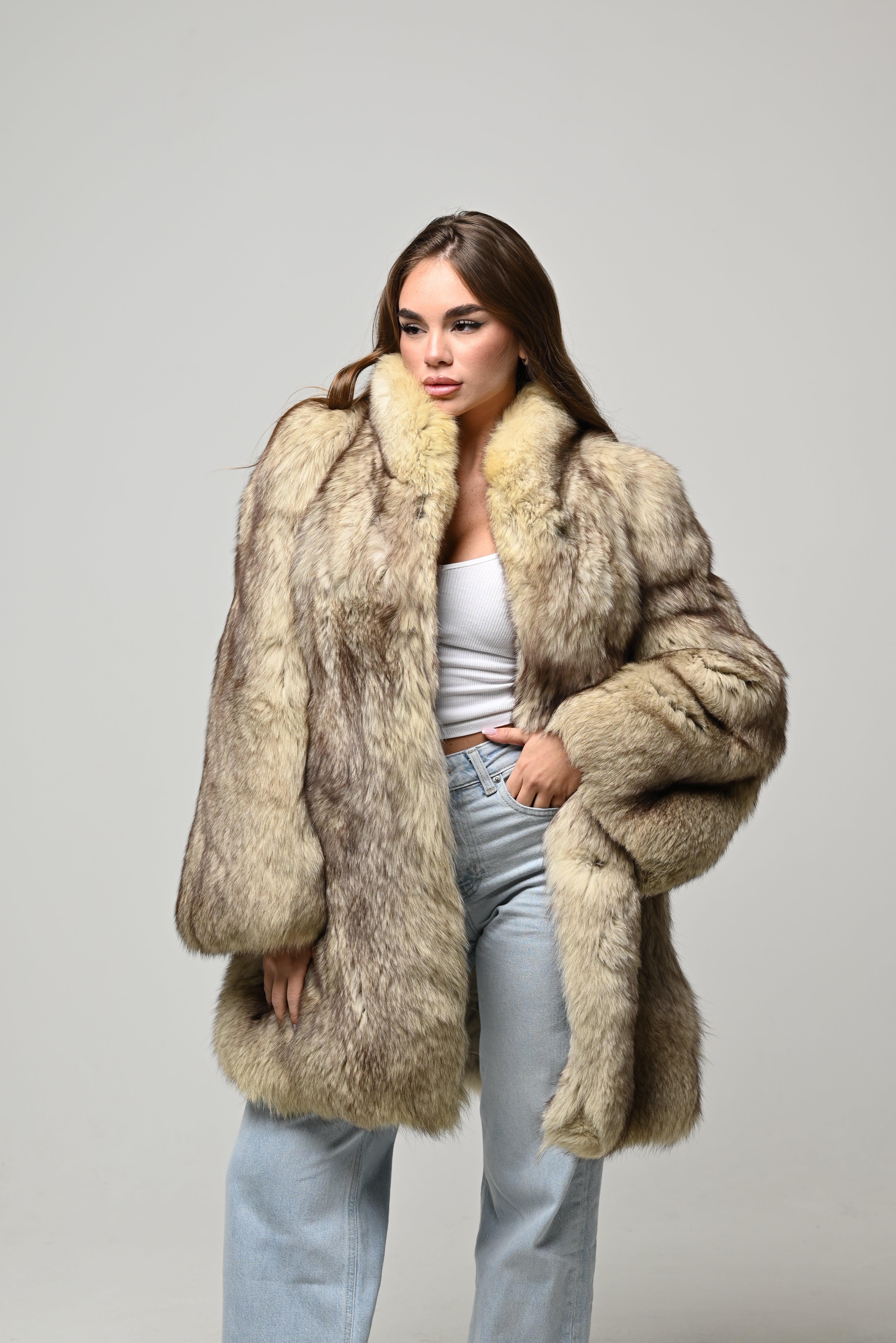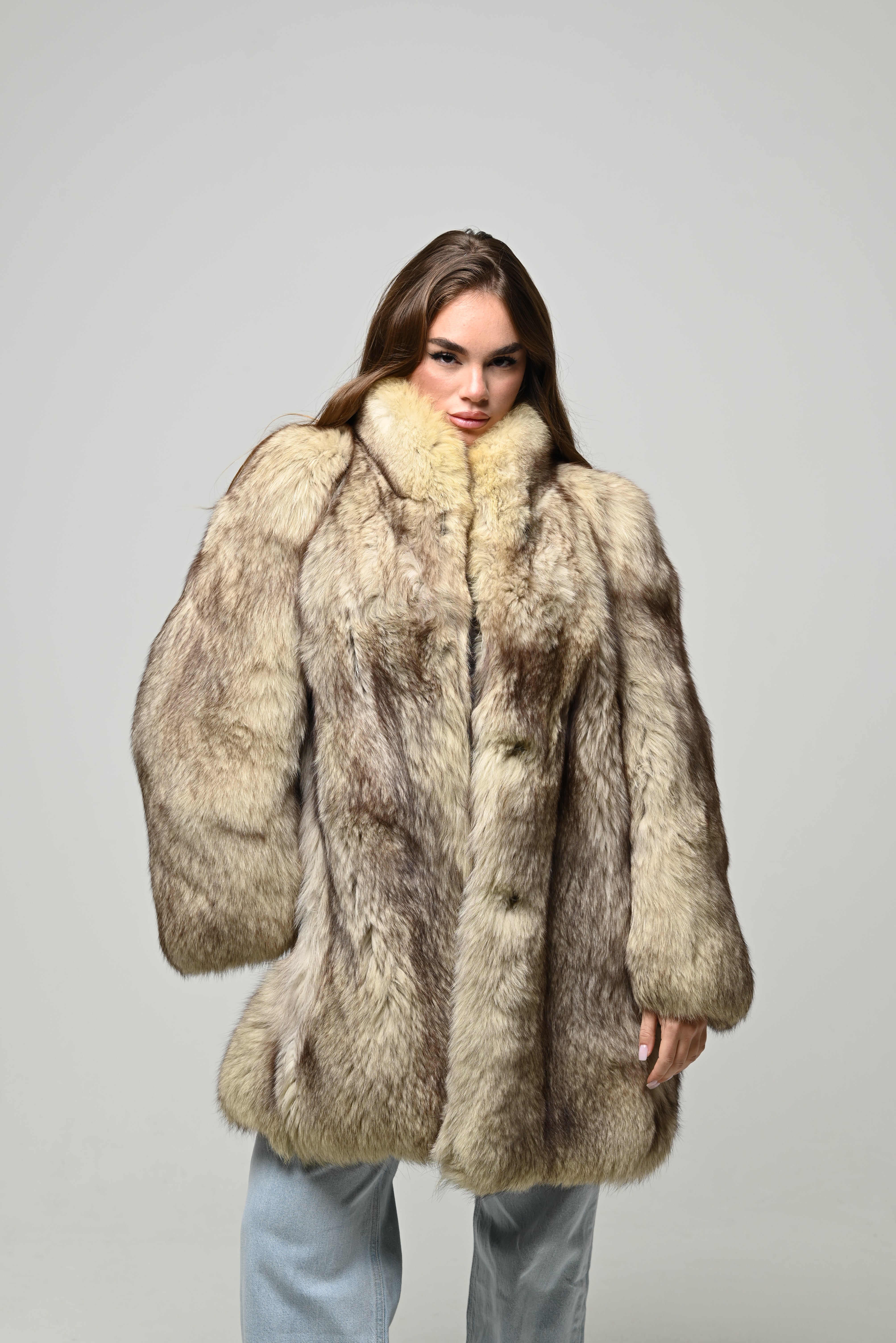 Pelliccia lunga dal taglio elegante e scenografico, caratterizzata da pelo folto e ultra morbido con raffinate sfumature naturali sui toni del beige, sabbia e nocciola. Il collo ampio e avvolgente incornicia il viso, mentre la linea dritta leggermente over dona volume, movimento e comfort. Un capo importante e senza tempo, ideale per look sofisticati ma perfetto anche per valorizzare outfit più casual.
