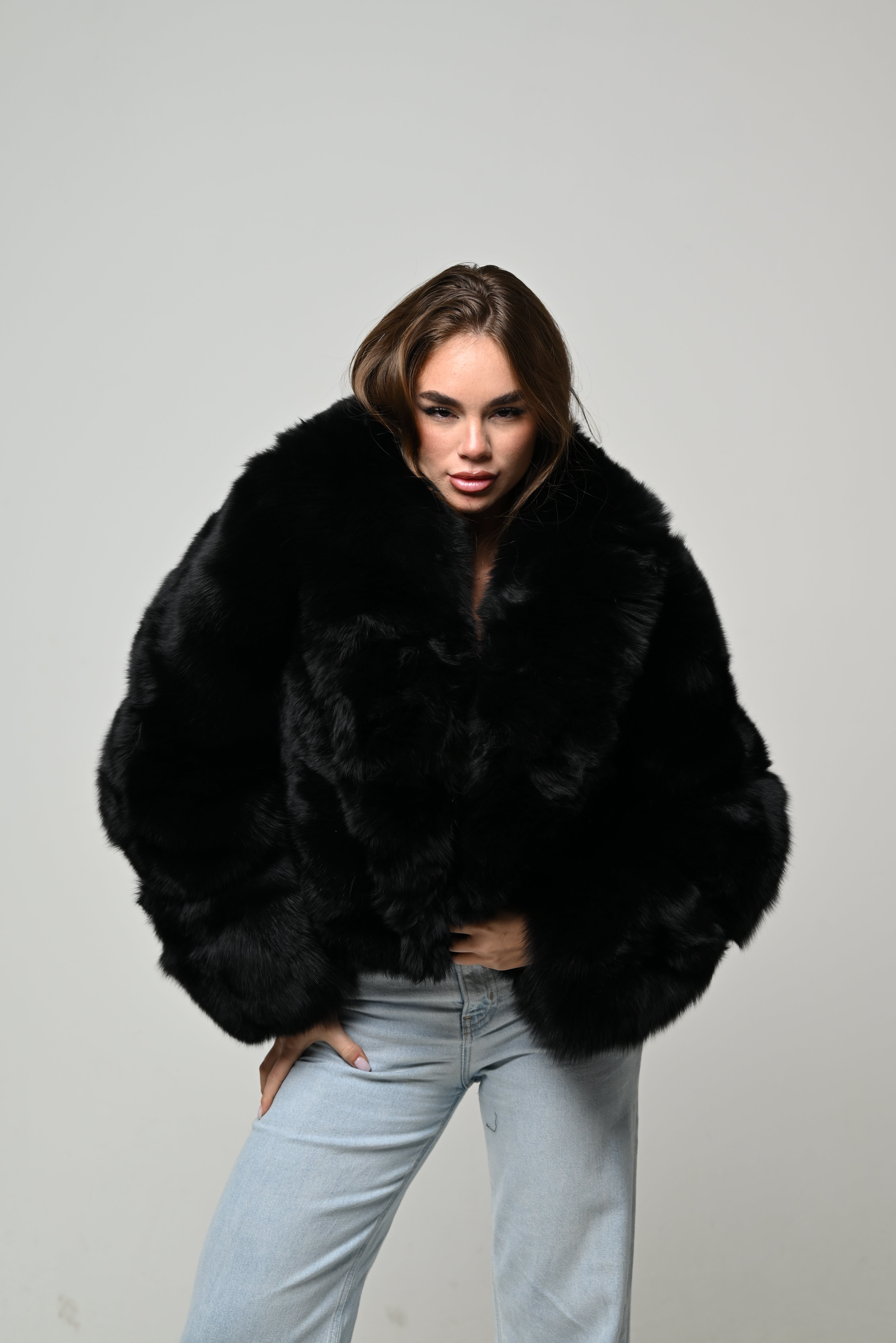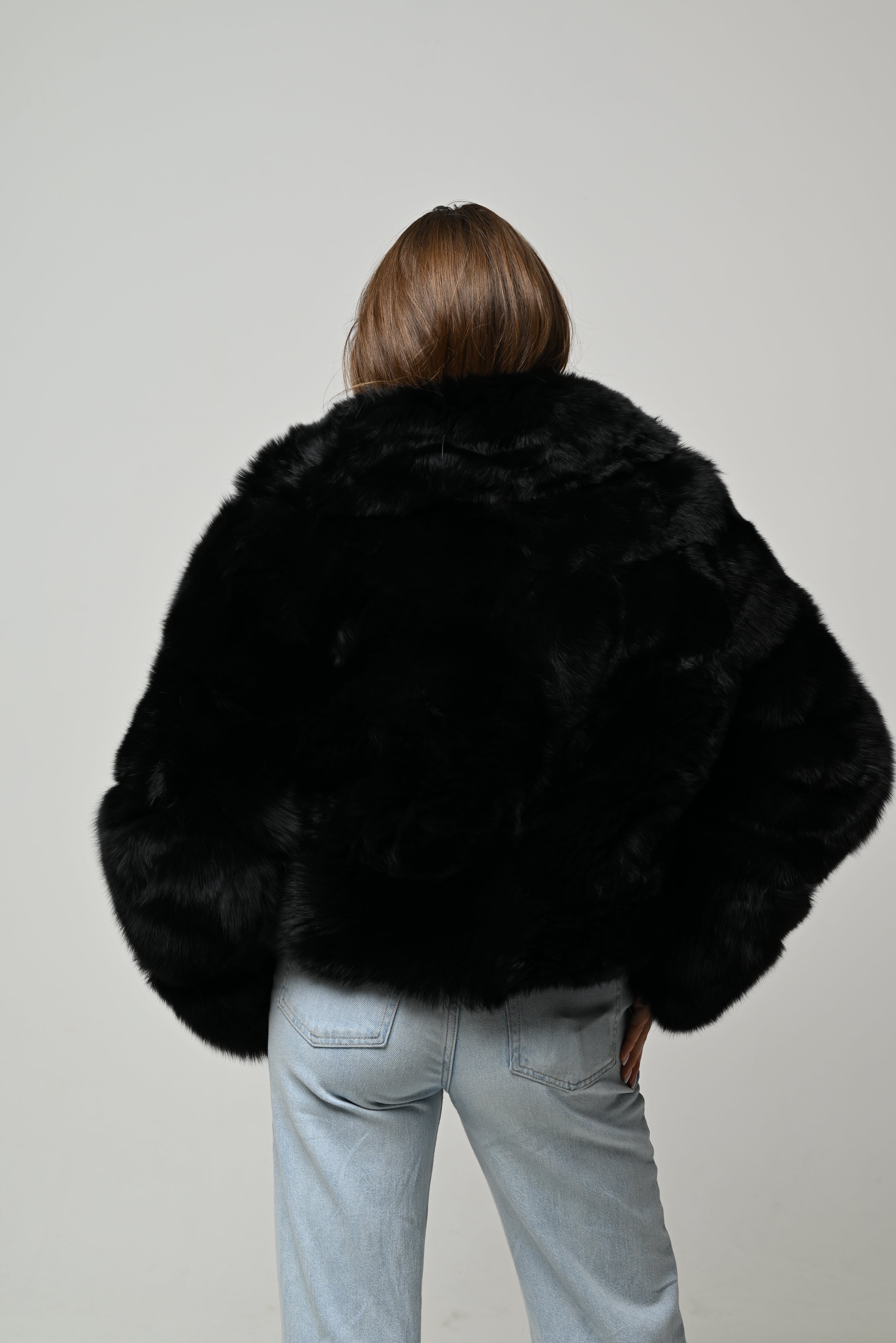 dal volume molto importante, caratterizzata da una silhouette oversize e strutturata, con spalle morbide e maniche ampie effetto balloon che creano un look deciso e contemporaneo. Il pelo è fitto, compatto e vellutato, con una superficie uniforme che riflette leggermente la luce, dando un aspetto estremamente lussuoso e pulito.