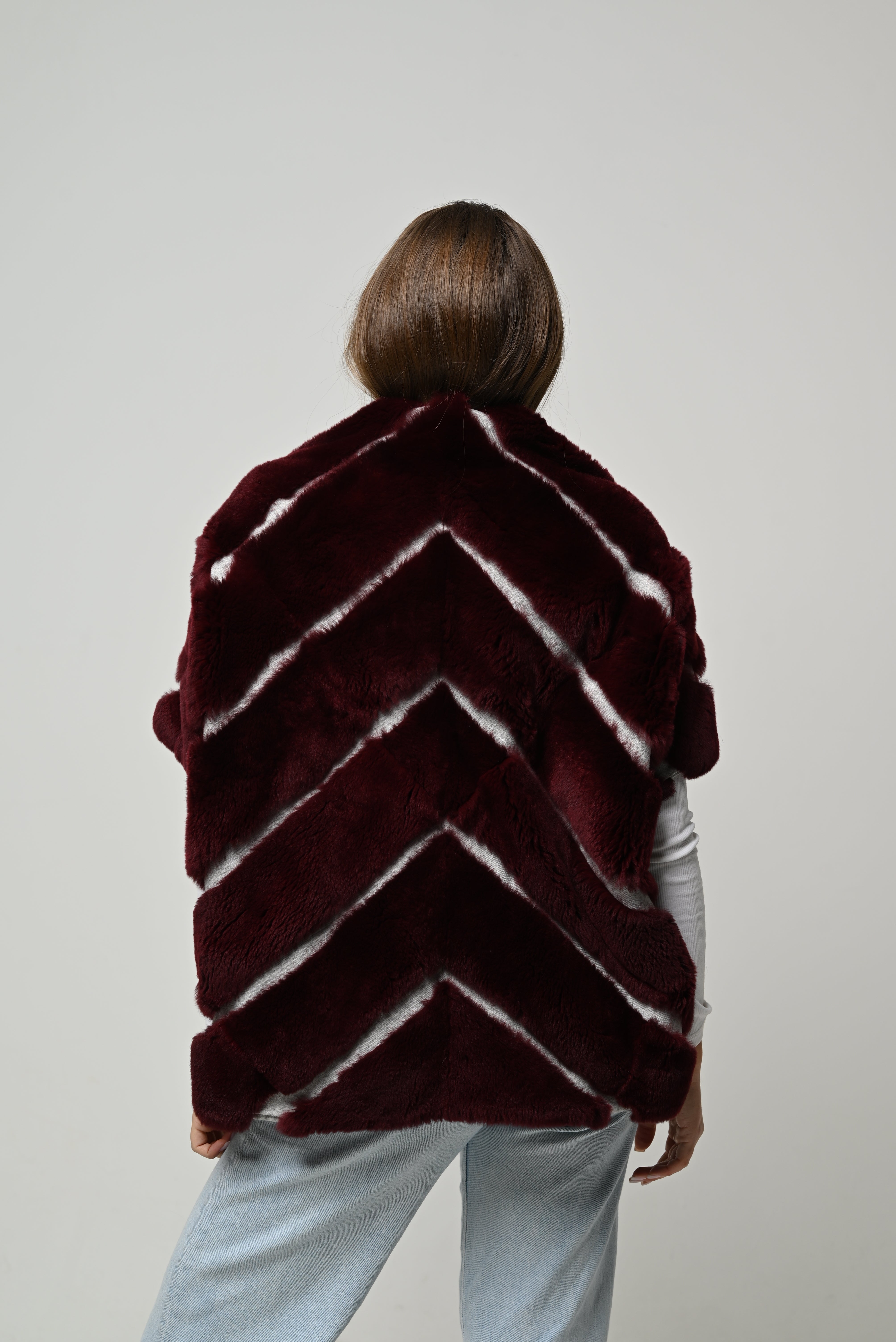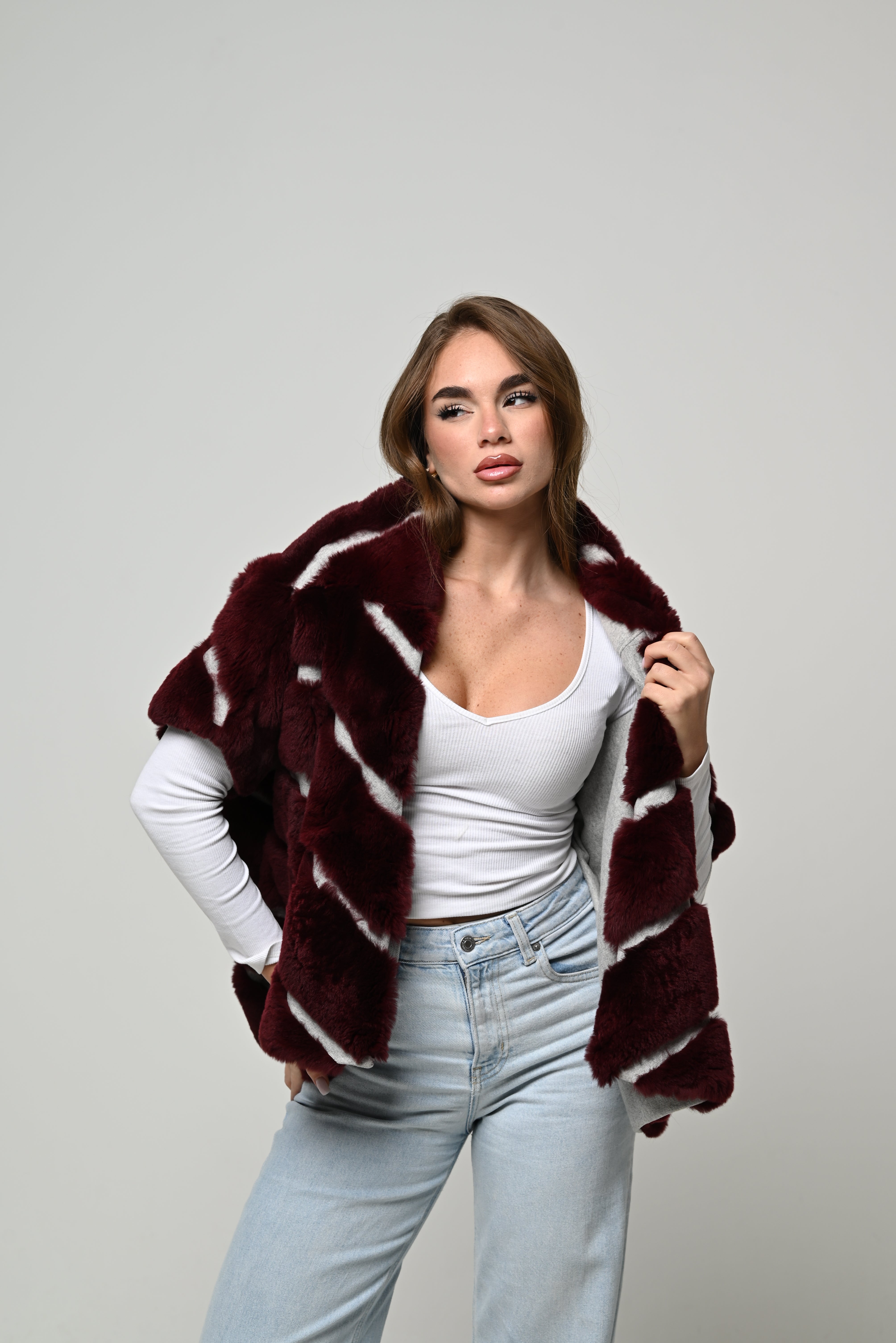 Pelliccia nuova in vera pelliccia naturale di rex, modello corto con linea morbida e vestibilità regolare. Pelo fitto, vellutato e ultra soffice, in una intensa tonalità bordeaux con inserti diagonali più chiari che creano un elegante effetto grafico. Spalle morbide, maniche ampie e scollo aperto per una silhouette moderna e femminile. Chiusura frontale invisibile e interno foderato per un comfort ottimale.