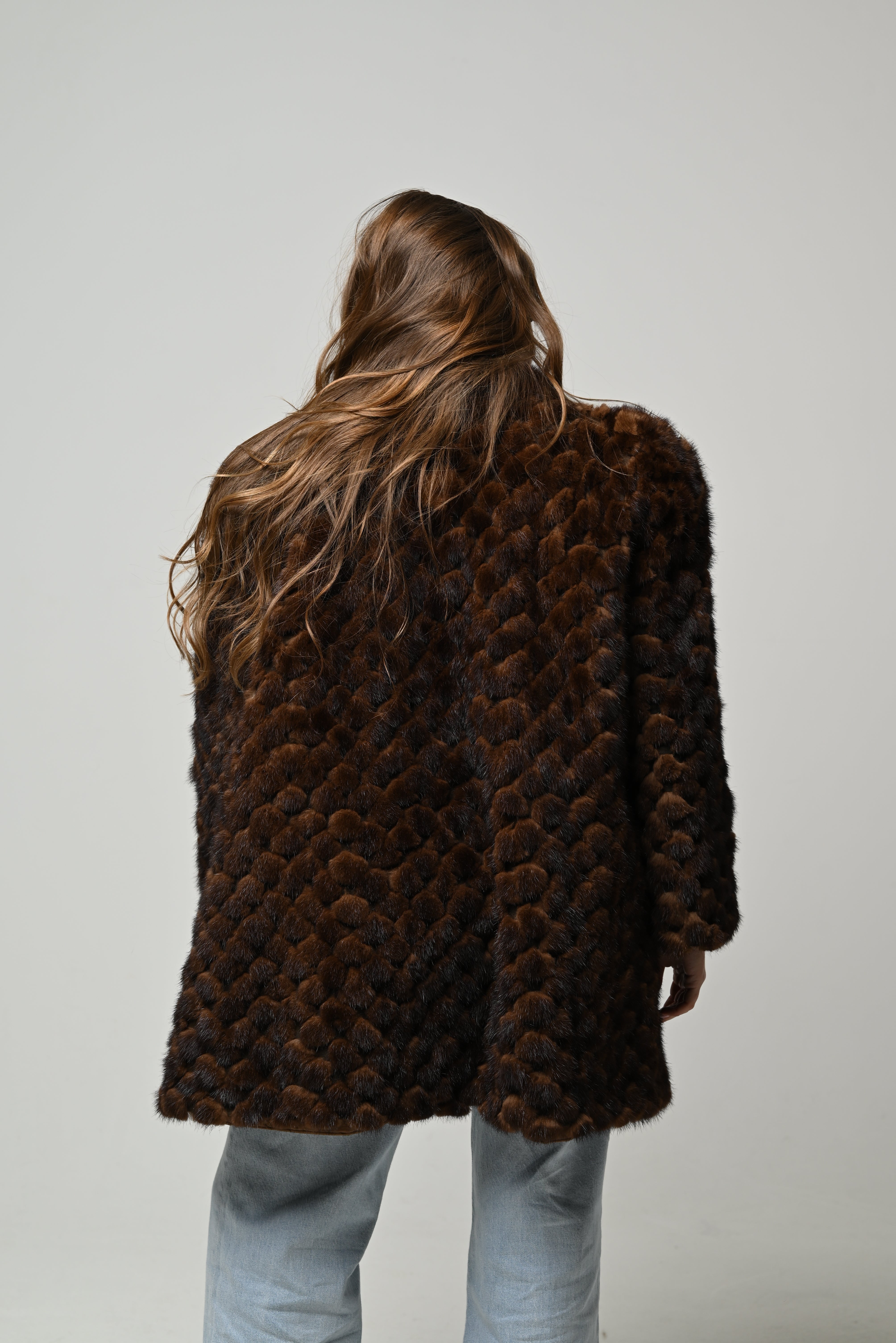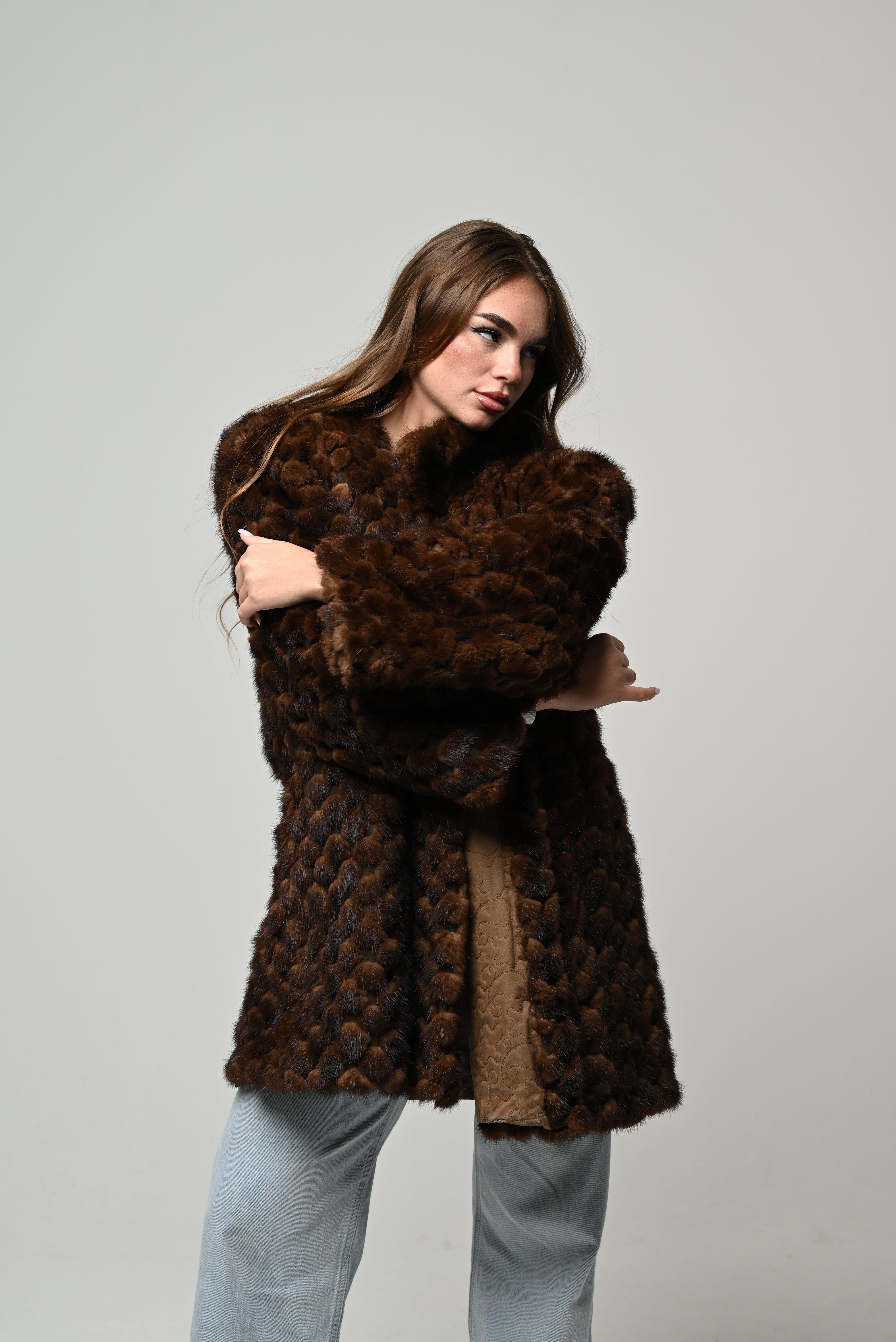 Pelliccia nuova in vera pelliccia naturale di visone, modello corto dalla linea morbida e vestibilità regolare. Pelo fitto, compatto e ultra soffice, in una raffinata combinazione caramello su base visone con sfumature nocciola e tocchi cioccolato che donano profondità e movimento al colore. Lavorazione a piccole fasce che crea un elegante effetto texture, spalle leggermente strutturate e maniche morbide. Scollo aperto, chiusura frontale invisibile e interno foderato per un comfort ottimale.